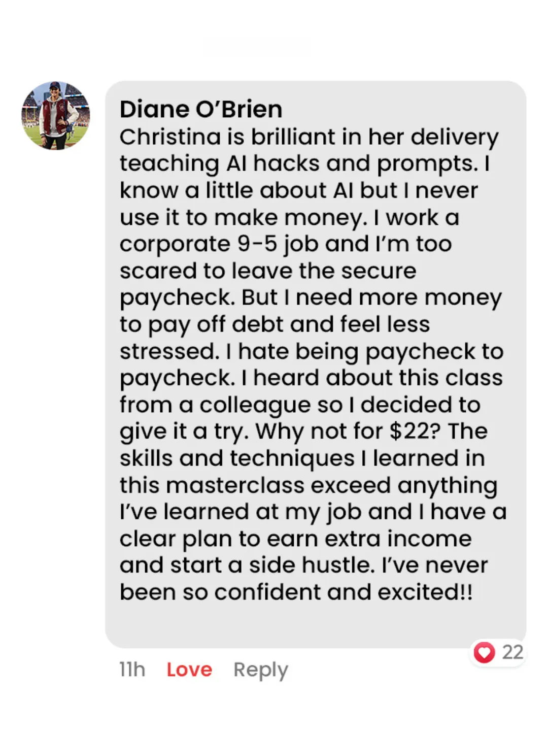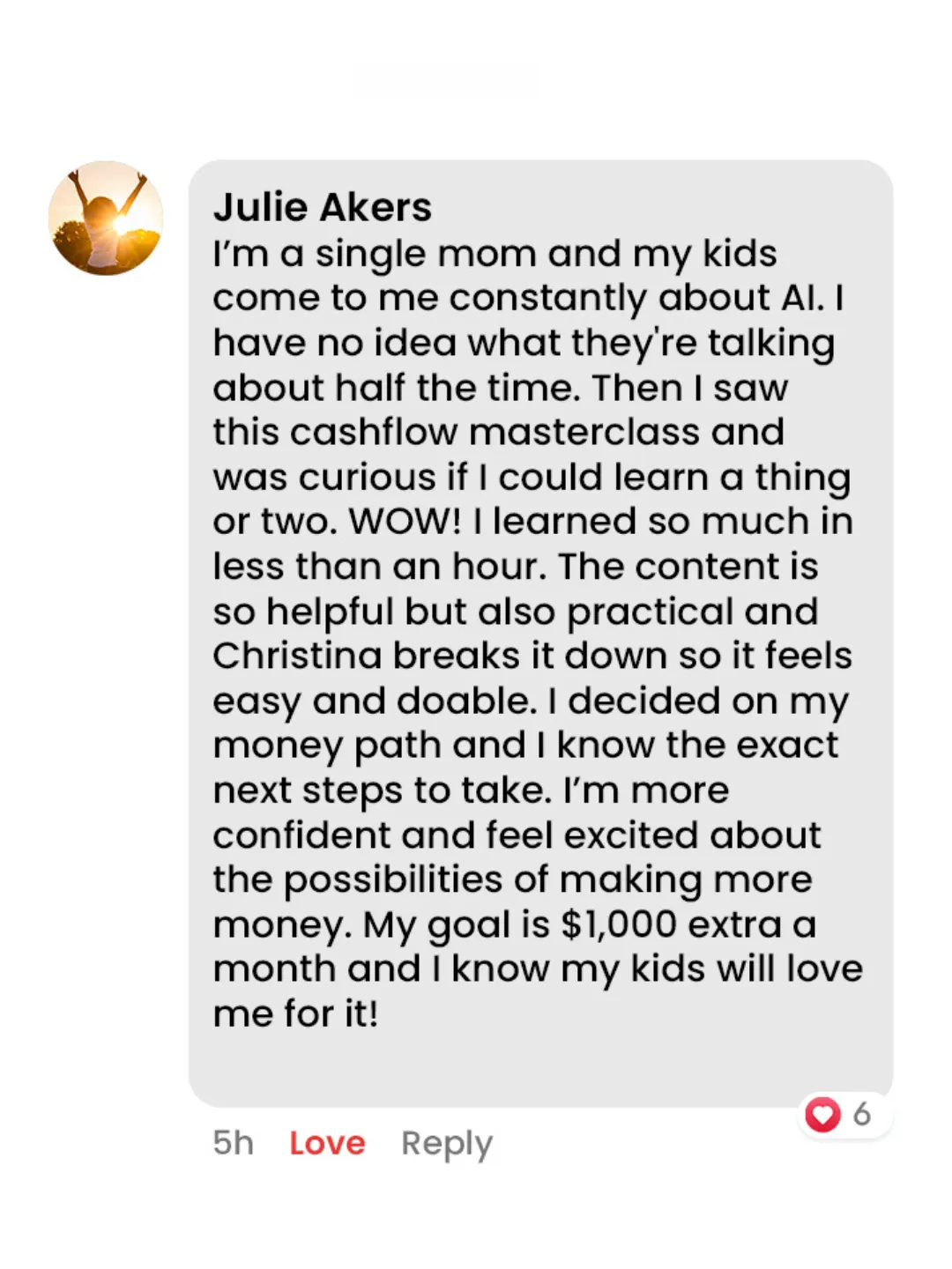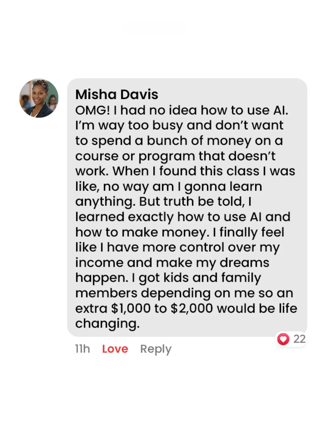 I've helped thousands of women make money online and offline over the past 10+ years. I'm a 3x Founder and I built a 7-figure business in two years. Now I teach women how to use AI as a shortcut to create income, freedom, and confidence -- without burnout.