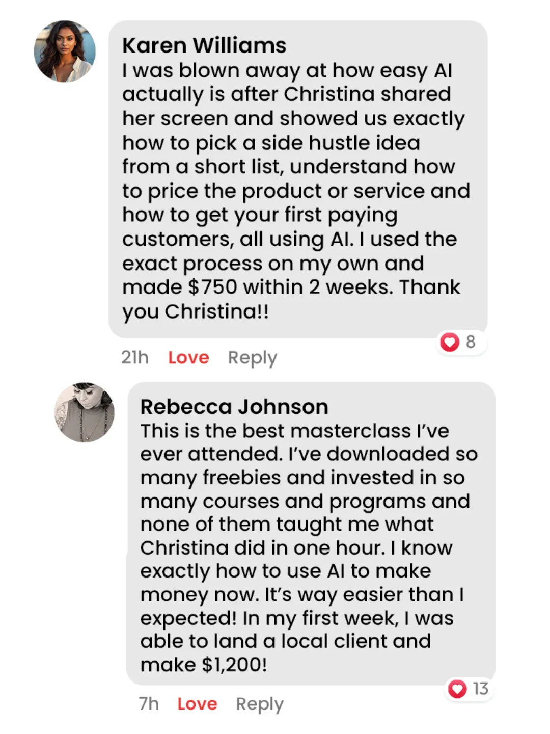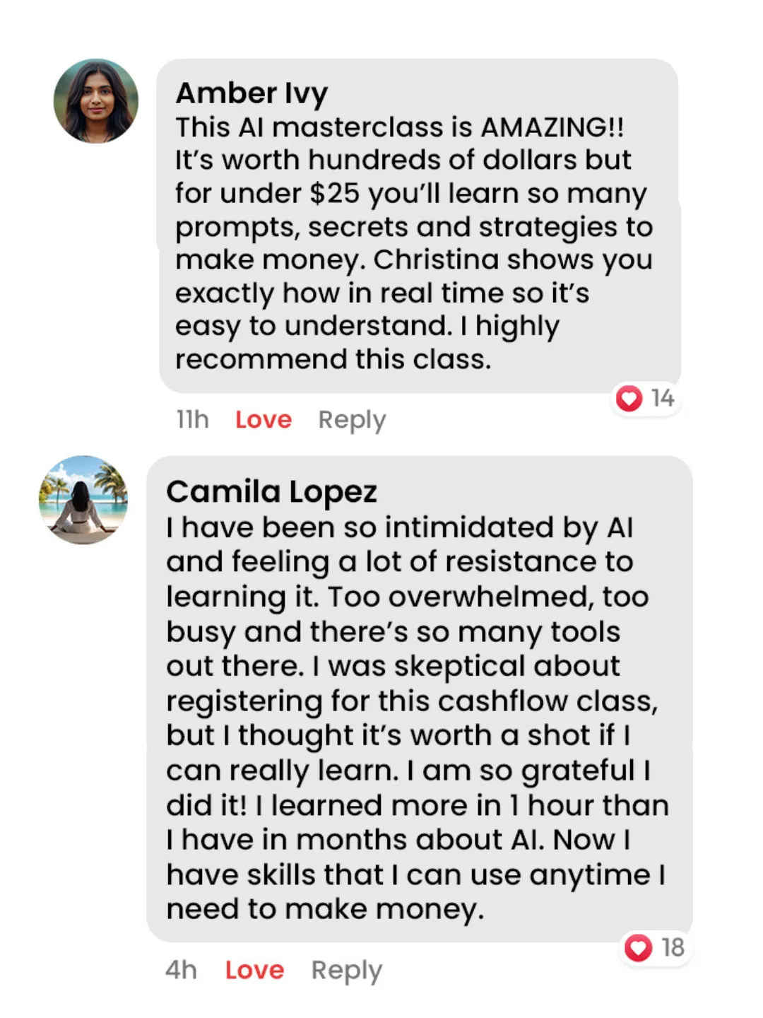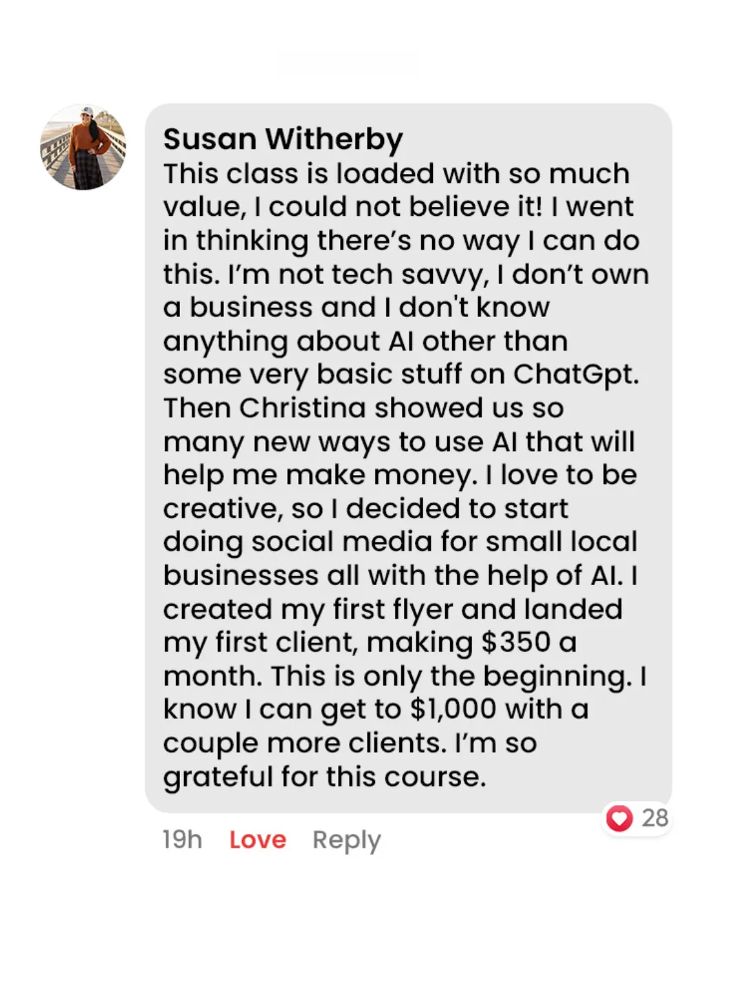 I've helped thousands of women make money online and offline over the past 10+ years. I'm a 3x Founder and I built a 7-figure business in two years. Now I teach women how to use AI as a shortcut to create income, freedom, and confidence -- without burnout.